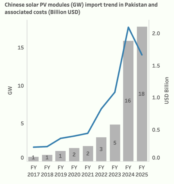En l’absence de registre national complet, les données d’importation offrent un aperçu crucial de la croissance du secteur. D’après Renewables First, le Pakistan a importé un total cumulé de 51,5 GW de modules solaires en provenance de Chine jusqu’à fin novembre 2025. Rien que lors du dernier exercice budgétaire clos en juin 2025, le pays a ajouté 18 GW à ses importations, portant le cumul à 48 GW pour un coût dépassant les 2 milliards de dollars.