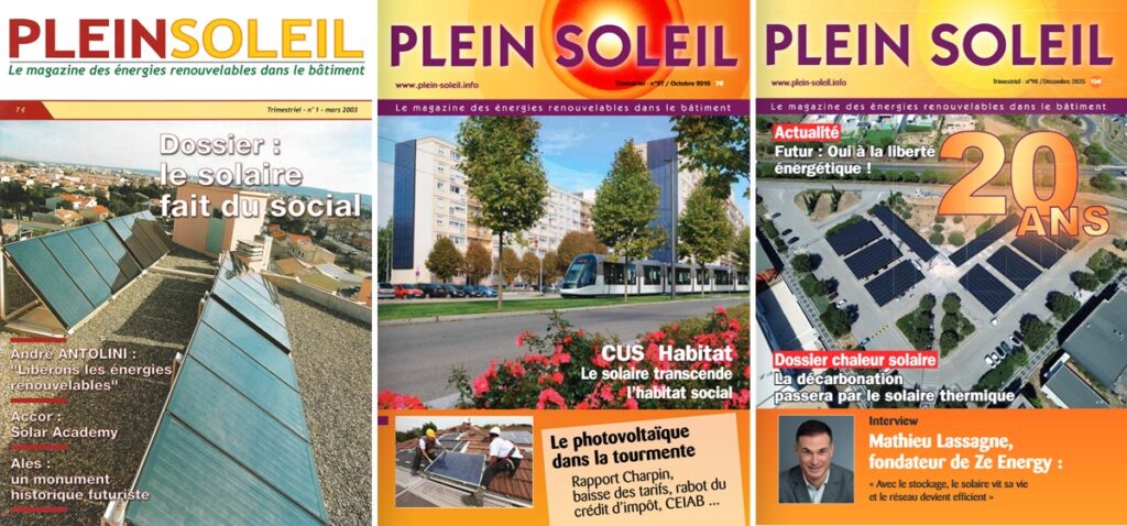 Lorsque le premier numéro de Plein Soleil paraît en 2005, l’énergie solaire en France est encore un secteur de niche. La Une de ce numéro historique mettait en avant le solaire thermique pour réduire les charges dans les bâtiments sociaux, une solution pragmatique pour alléger le budget des locataires tout en luttant contre les émissions de gaz à effet de serre. À cette époque, le photovoltaïque (PV) restait confidentiel, porté principalement par des militants convaincus ou déployé sur des sites isolés, en montagne ou sur les îles.